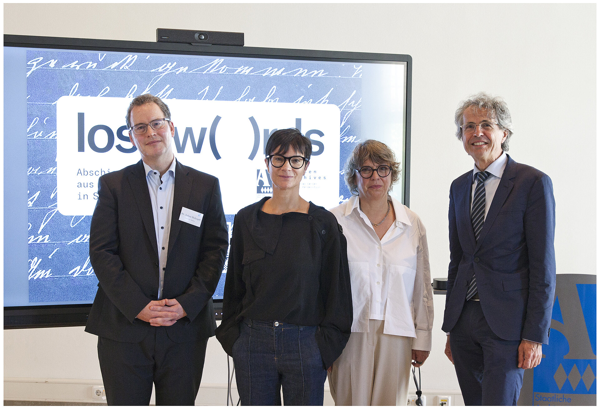 BU 2 v.l.n.r.: Dr. Bernhard Grau, Generaldirektor der Staatlichen Archive Bayerns; Floriane Azoulay, Direktorin der Arolsen Archives, International Center on Nazi Persecution; Dr. Anke Münster, Arolsen Archives, International Center on Nazi Persecution, Head of Public Relations/ Projektleitung; Dr. Julian Holzapfl, Leiter des Staatsarchivs München