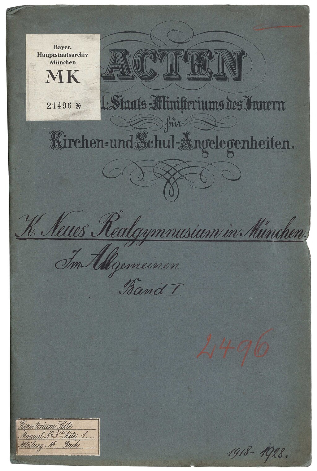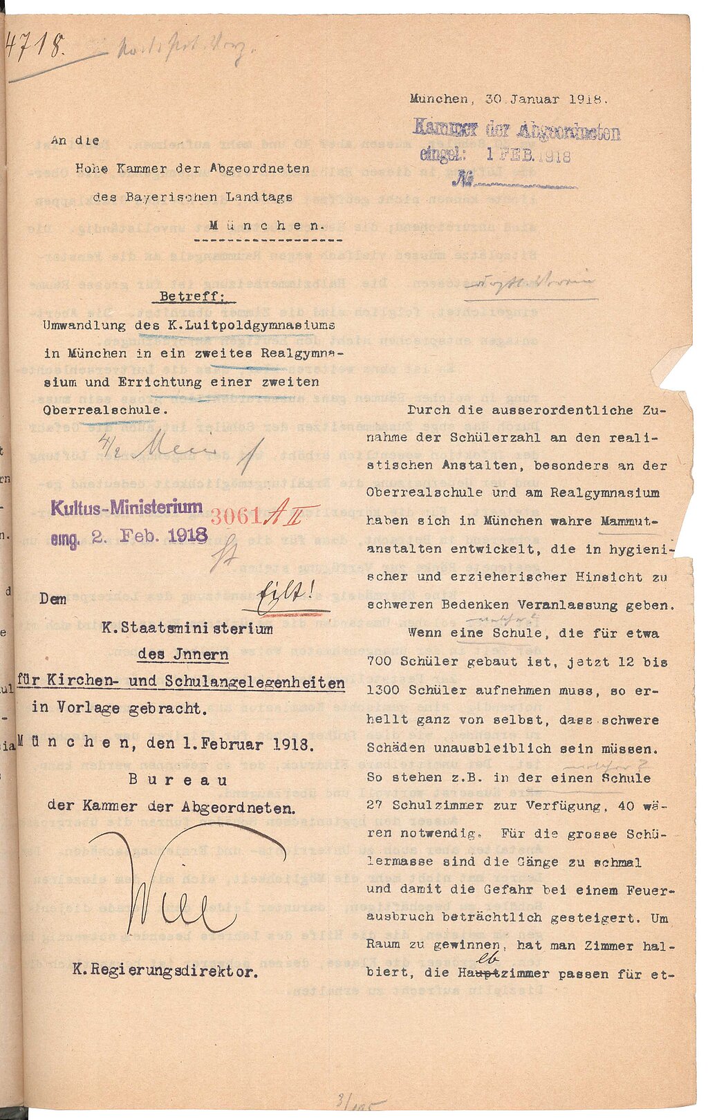 Bayerisches Hauptstaatsarchiv, MK 21496 (Schreiben zur Errichtung einer zweiten Oberrealschule in München, 1918).