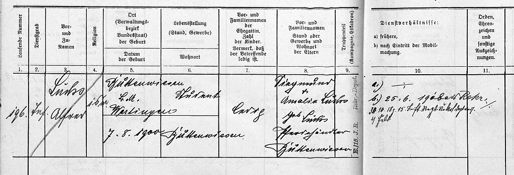 Zu einzelnen Schülern wird man in der staatlichen Überlieferung nur in Ausnahmefällen unmittelbar fündig werden. Ausnahmen sind Schüler, die eine Schule besucht haben, deren Schülerakten übernommen werden oder besondere Fälle. Eine weitere Ausnahme sind Schüler bzw. Absolventen, die im bayerischen Heer gedient haben. Für diese Personen gibt es einen Eintrag in der Kriegsstammrolle. Ein eigenes bayerisches Heer gab es bis 1918. Alfred Luchs, geb. am 7.8.1900 in Buttenwiesen, ein ehemaliger Schüler des Neuen Realgymnasiums in München, wurde am 13.7.1918 vereidigt und diente in der Endphase des Ersten Weltkriegs.