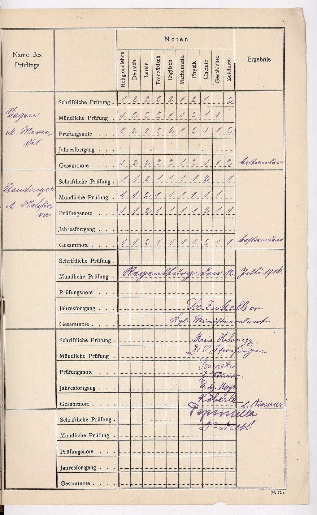 Bayerisches Hauptstaatsarchiv, MK 21990 (Notenübersicht zur Abiturprüfung, 1916).