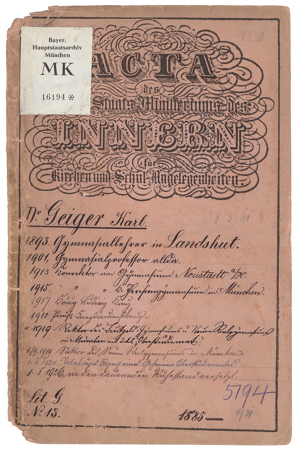 Bayerisches Hauptstaatsarchiv, MK 16194 (Personalakt Dr. Karl Geiger, 1885–1931).