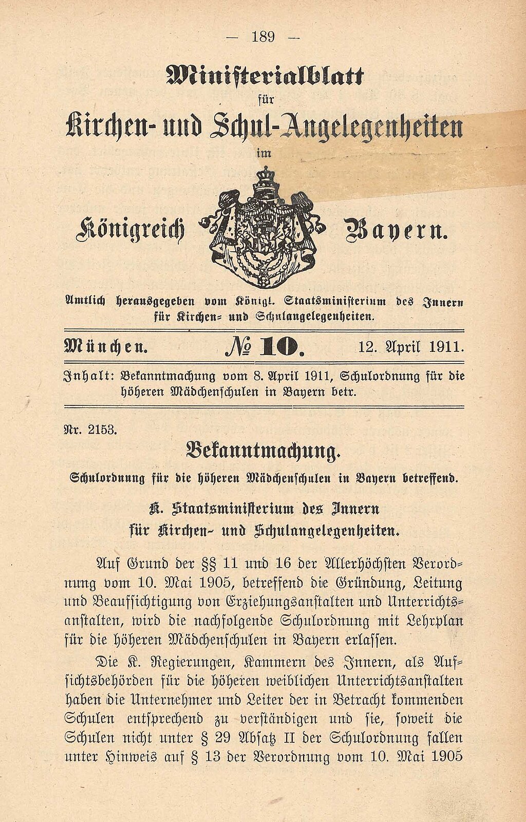 Schulordnung für die höheren Mädchenschulen in Bayern, KMBl 1911, S. 189–306.