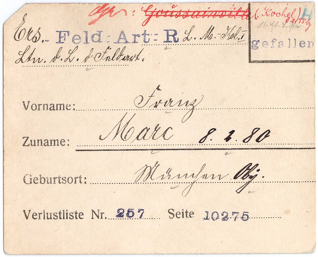 Bayerisches Hauptstaatsarchiv, Abteilung IV Kriegsarchiv,Verlustkartei Kasten 57 (Verlustkarte Franz Marc, 1916).