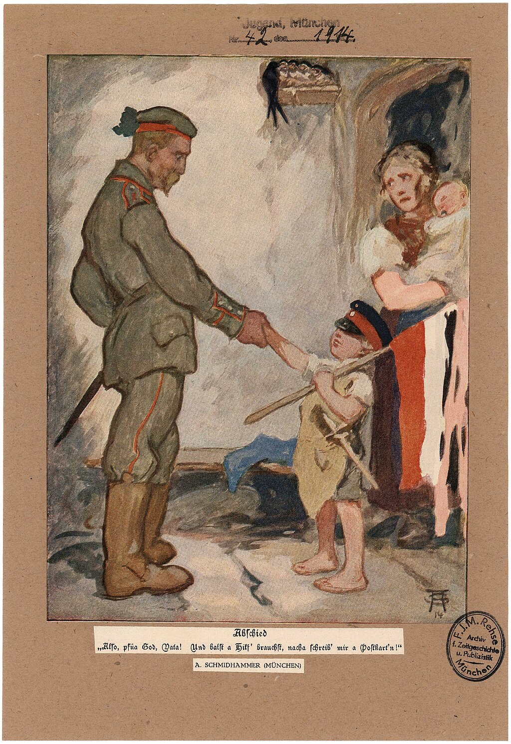 Bayerisches Hauptstaatsarchiv, Presseausschnittsammlung 2967 (Soldat nimmt Abschied von seiner Familie, Zeichnung von Arpad Schmidhammer in der Zeitschrift „Jugend“ 39/1914).