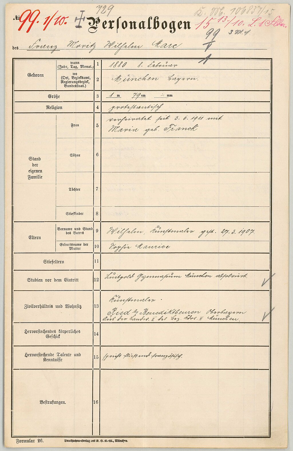 Bayerisches Hauptstaatsarchiv, Abteilung IV Kriegsarchiv, Offizierspersonalakt 2609 (Personalbogen Franz Marc, 1900–1921).