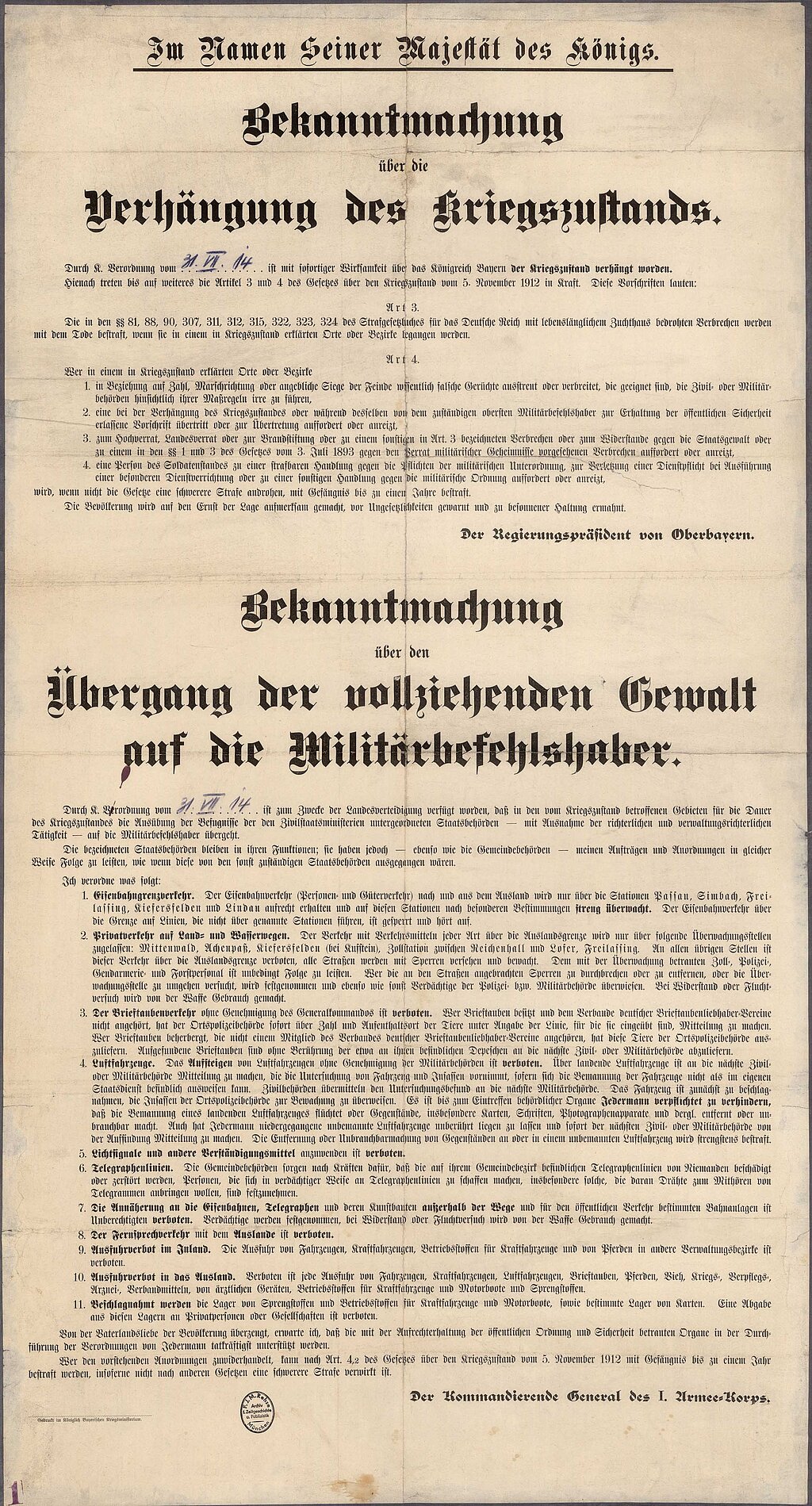 Bayerisches Hauptstaatsarchiv, Plakatsammlung 2 (Bekanntmachung über Verhängung des Kriegszustandes, 1914).