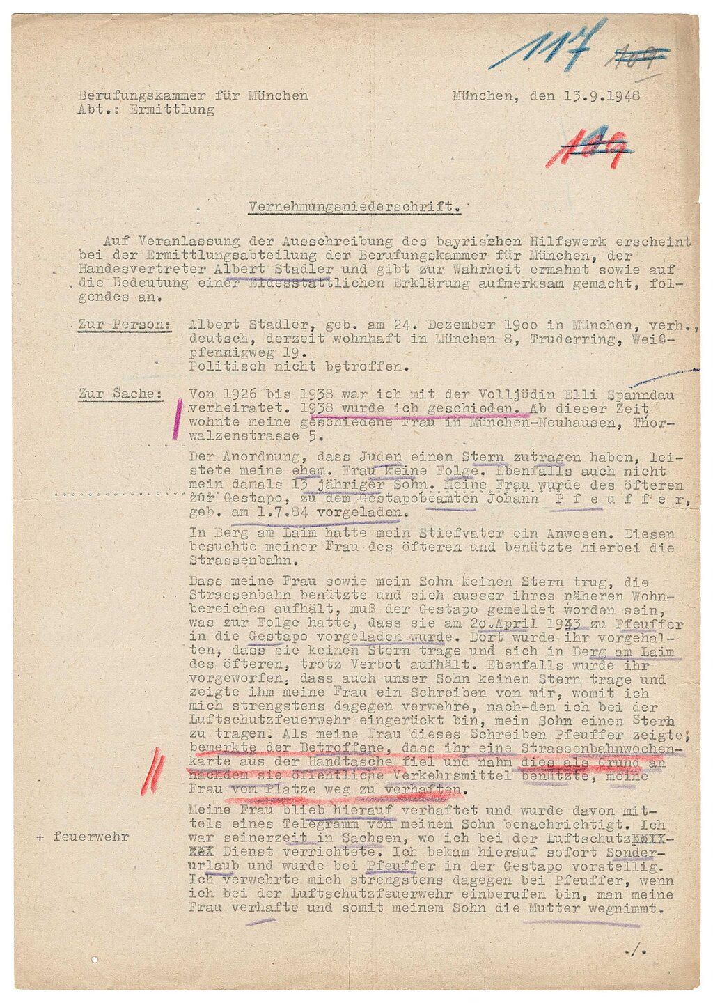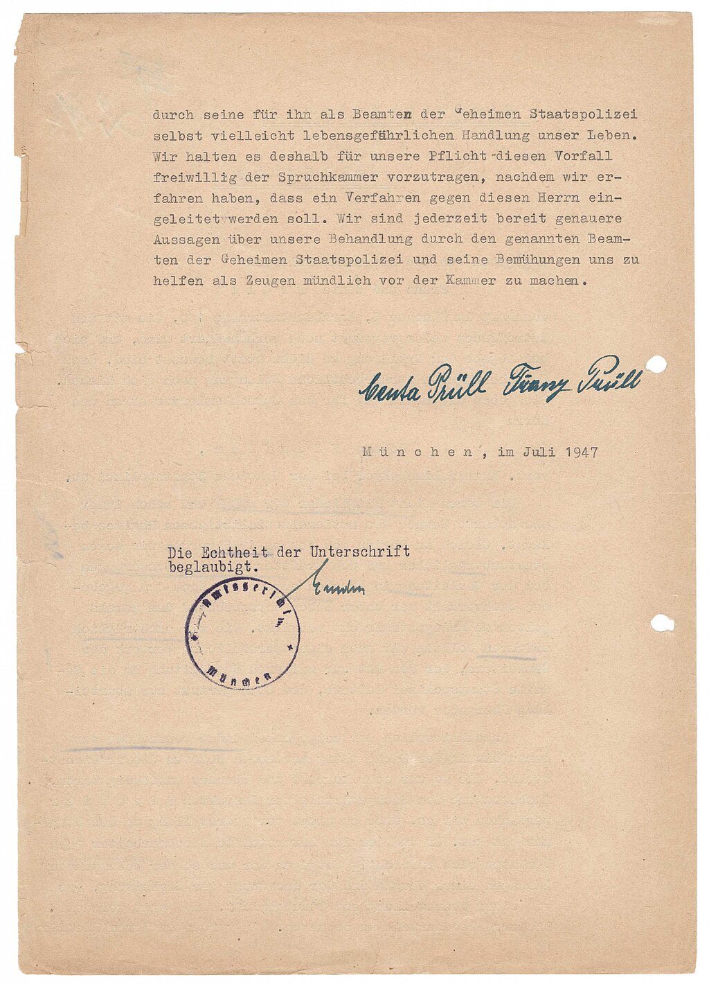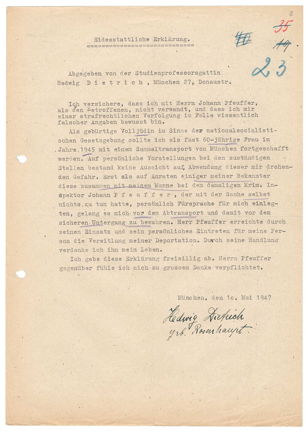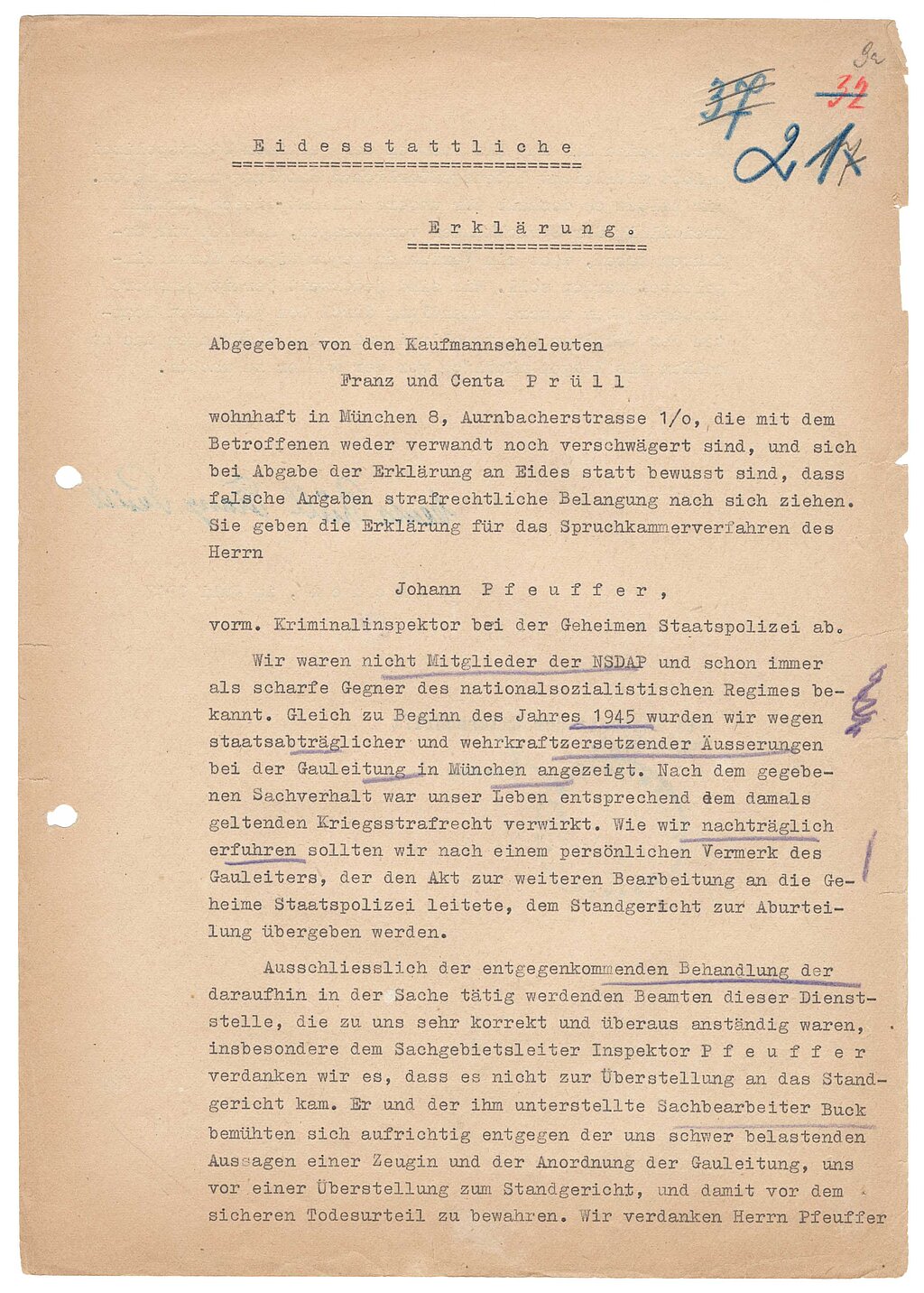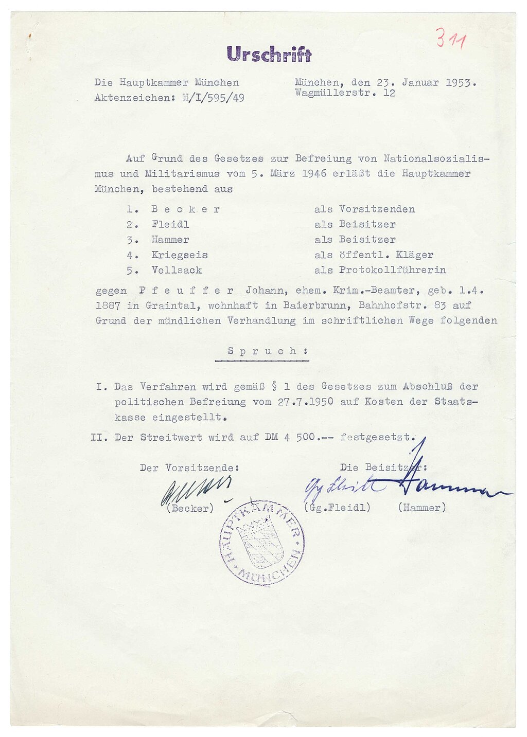 Staatsarchiv München, Spruchkammerakten Karton 1316, Johann Pfeuffer, Kriminalinspektor bei der Geheimen Staatspolizei (Zeugenaussagen und Spruch, 1947–1953).