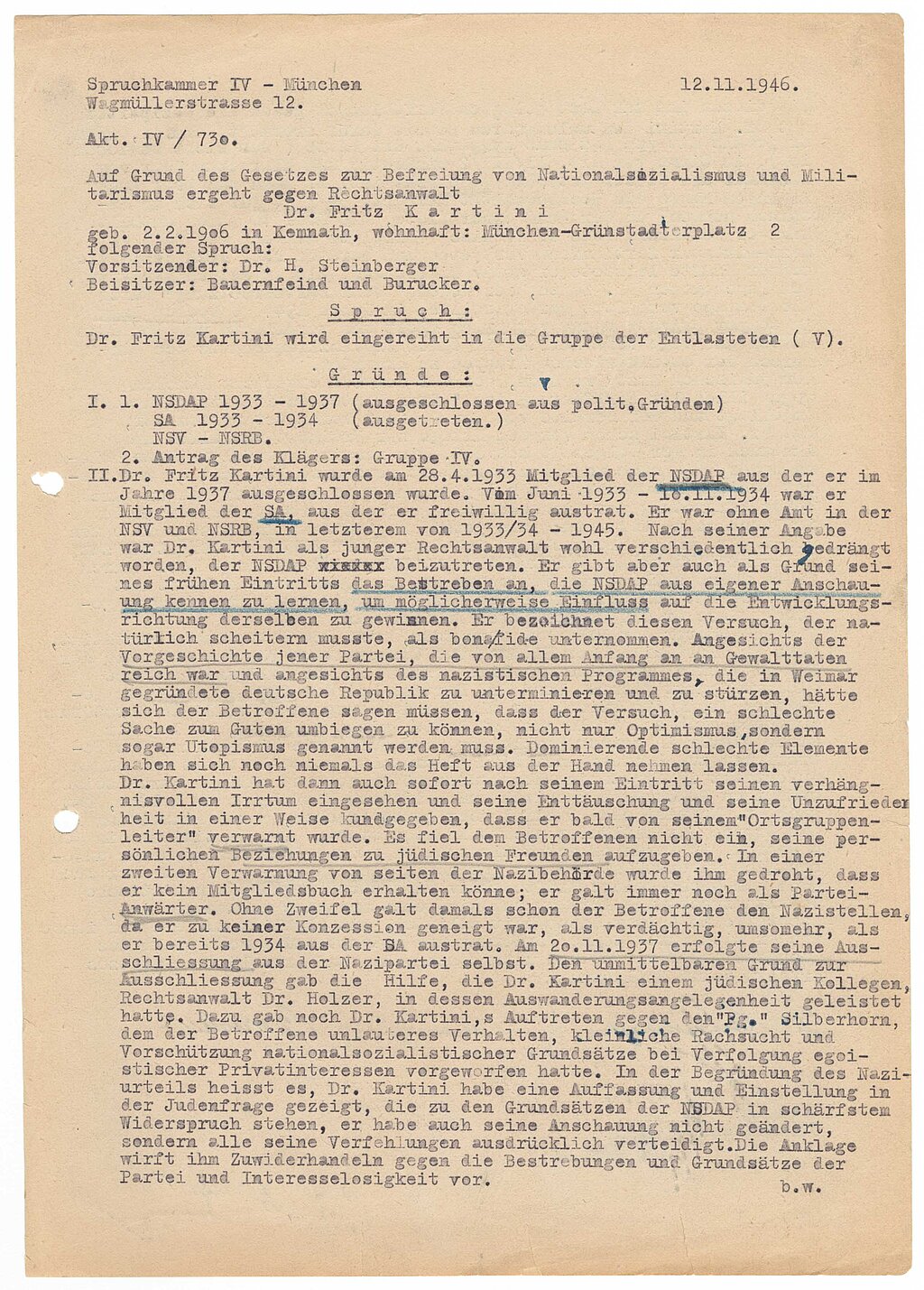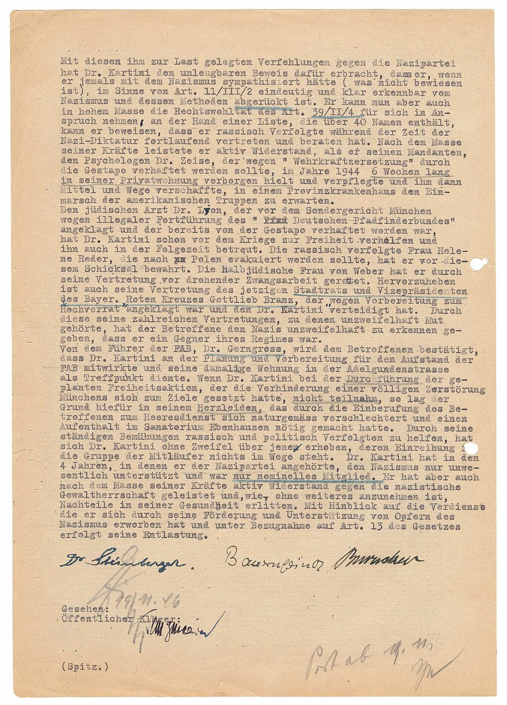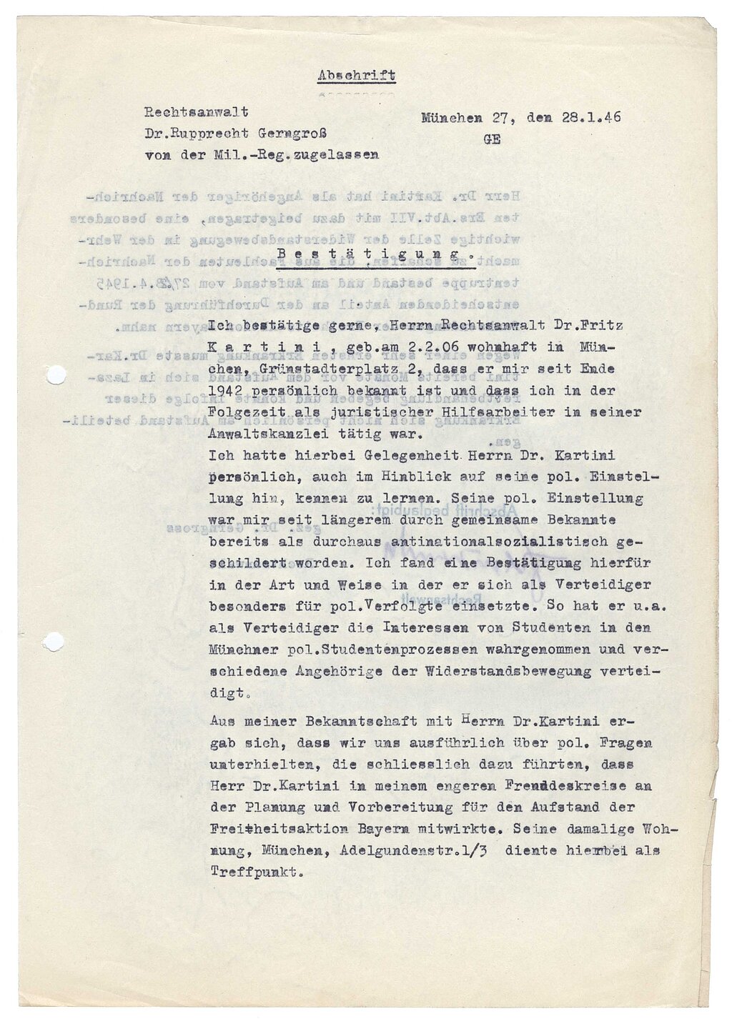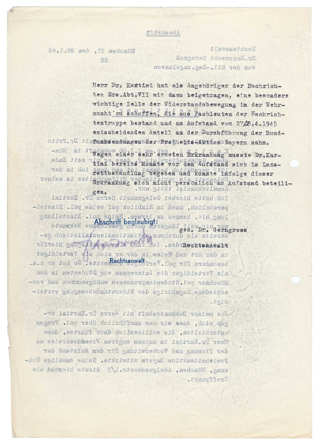 Staatsarchiv München, Spruchkammerakten Karton 842, Dr. Friedrich Kartini, Mitorganisator der Widerstandsbewegung „Freiheitsaktion Bayern“ (Spruch und Aussage von Dr. Rupprecht Gerngross, Anführer der „Freiheitsaktion Bayern“, 1946).