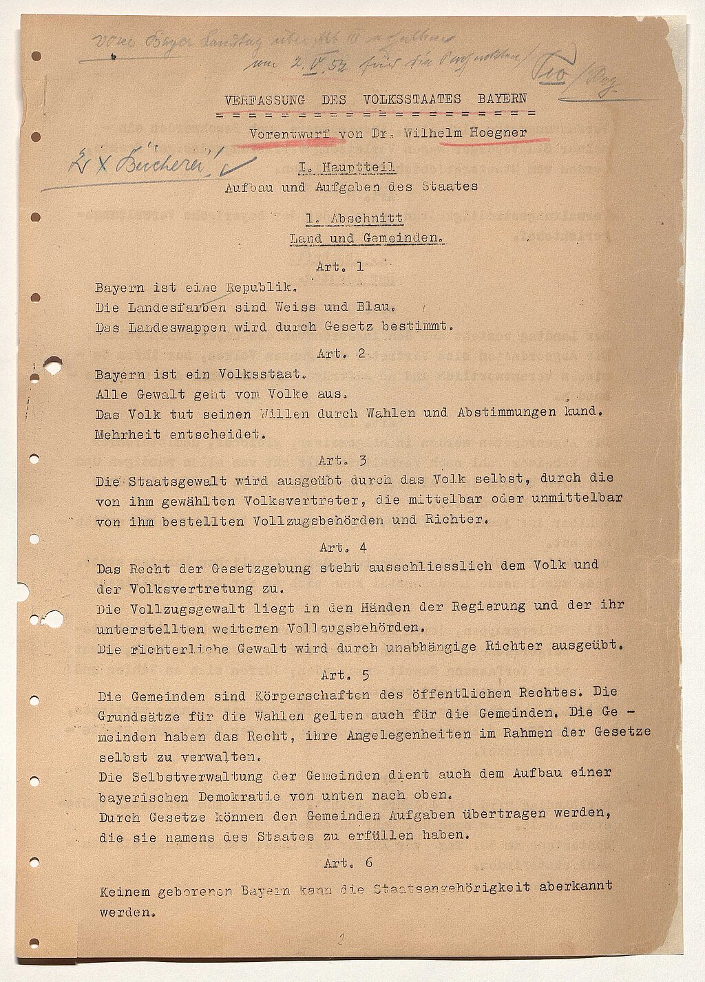 Bayerisches Hauptstaatsarchiv, StK 10907 (undatierter Vorentwurf zur Verfassung des Volksstaates Bayern, [1946]).