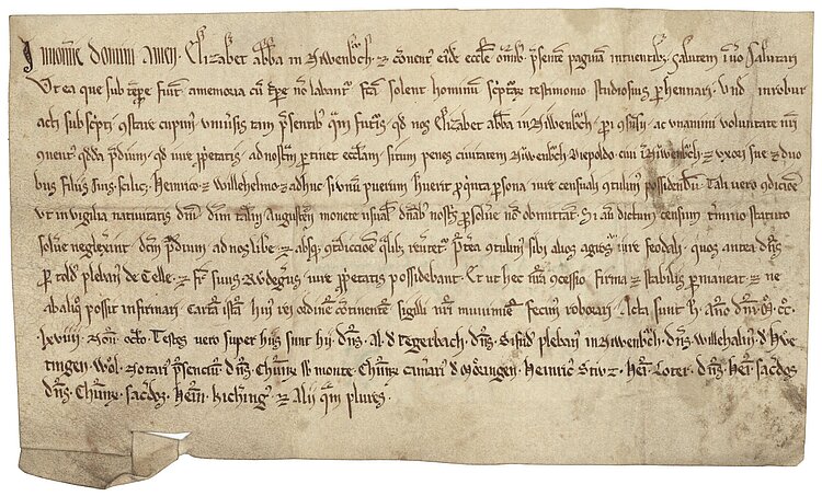 Erläuterung: Die Abbildung zeigt eine frühe Siegelurkunde des Benediktinerinnenklosters Neuburg a.d. Donau, die zusätzlich eine ganze Reihe von Elementen aufweist, die aus der älteren Königs- und Papsturkunde übernommen sind. Sie nennt unter den Zeugen sogar den die Urkunde verfassenden und wohl auch schreibenden Notar: „Wol notarius presencium“. Die Auszeichnungsschrift der verbalen Invokatio (Anrufung Gottes) sowie das gelegentlich verwendete diplomatische Kürzungszeichen sind weitere Relikte aus der älteren Königsurkunde.