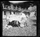 Gegend von Schliersee (Lkr. Miesbach): 2 Frauen, ein Mädchen und ein kleiner Junge an einem gedeckten Tisch in einem Garten, daneben ein Hund, im Hintergrund ein Haus mit langgestrecktem Balkon |