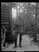 Unbekannte Ortschaft [Litauen/Weißrussland/Ukraine?]: Offizier mir Pickelhaube, aufgesetzter Gasmaske und vorgehaltener Pistole neben einem Holzhaus |