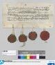 Burggraf Friedrich der Ältere von Nürnberg sowie Johann und Friedrich, dessen Söhne, einerseits und die Bürger der Stadt Nürnberg andererseits versprechen die zu Heilsbronn vereinbarten und in drei Briefen niedergelegten Abmachungen über den neuen Turm bei der burggräflichen Veste, die Stadtmauer und den Graben, den Wald und die den Rat nicht berührenden Ansprüche gegen einige Nürnberger Bürger getreulich zu halten. - Siegler: die drei Burggrafen sowie die Stadt Nürnberg. |