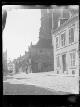 Unbekannte Ortschaft [Rumänien?]: gepflasterte Ortsstraße, im Hintergrund ein gedrungener Kirchenbau mit hohem, am oberen Bildrand abgeschnittenen Kirchturm |