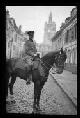 Nicht identifizierbare Ortschaft in Nordfrankreich oder Belgien: Offizier mit Schirmmütze, Schnurrbart und Nickelbrille auf einem Pferd auf einer gepflasterten Ortsstraße, im Hintergrund ein Kirchturm (Seitansicht) |