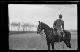Nicht identifizierbare Ortschaft in Nordfrankreich oder Belgien: Offizier mit grauem Vollbart in Husaren-Uniform auf einem Pferd auf einem Reitplatz, im Hintergrund ein kahle, lichte Baumgruppe (Seitansicht, dem Betrachter zugewandt) |