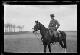 Nicht identifizierbare Ortschaft in Nordfrankreich oder Belgien: Offizier mit grauem Vollbart in Husaren-Uniform auf einem Pferd auf einem Reitplatz, im Hintergrund ein kahle, lichte Baumgruppe (Seitansicht) |