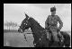 Nicht identifizierbare Ortschaft in Nordfrankreich oder Belgien: Offizier mit grauem Vollbart in Husaren-Uniform auf einem Pferd auf einem Reitplatz, im Hintergrund ein kahle, lichte Baumgruppe (Seitansicht, Nahaufnahme) |