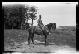Nicht identifizierbare Gegend in Nordfrankreich oder Belgien: Offizier mit Backenbart mit Schirmmütze auf einem Pferd auf einem Reitplatz, im Hintergrund Wälder und Felder (Seitansicht) |