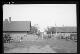 Enthält: Holzgatter vor reetgedeckten Gebäuden mit hohem Holzkreuz und einem linksdrehend bemalten hohen Holzpfahl |