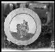 Unbekannte Gegend [Nordfrankreich?]: bemalte Holzscheibe, darauf ein hässlich gezeichneter, dicker Soldat in einem gepolsterten Korbsessel mit den Aufschriften "Rouen", "Calais", "Dünkirchen" und "(...)", daneben eine hagere Frauensperson |