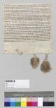 Graf Gebehard v. Hirzperg verzichtet gegenüber dem Deutschen Haus [zu Ellingen] auf alle Ansprüche auf die Eigenleute, die der verstorbene Berthold v. Mezzingen demselben - unter Ausschluss der edlen, rittermäßigen Leute - vermacht hat sowie auf die demselben an Heinrich dem Ebenberger hinterlassenen Güter. - Zeugen: Heinrich der Schenke von Hofsteten, der Camerawer, Hartwig von Sinnenbach, die beiden Brüder Marquard v. Mezzingen, Bruder Rüdiger der Raubetasche, Bruder Johannes v. Kirchberge. - Namen der Eigenleute: Marquard der Namenlose, dessen Bruder der Briwe (Bra{e}u) und deren Kinder, Gebehart der smit, dessen Bruder, der Einkorn, und seine Kinder, der Fleischmann, sein Bruder, der Ho{e}nlin, Schottelin und seine Kinder, der Vetter, des Schedels Kinder, Veirlin und ihre Geschwister und deren Kinder, Saumerin und ihre Kinder, Reger und seine Geschwister, die Smidin und ihre Kinder, Beringer, der Weise, und seine Kinder, Hermann Reisener und seine Hausfrau, Conrad Hersvogel und sein Weib, der Stoer und seine Kinder, die Soetn und ihre Kinder, die zwei Heinrich vom Holz, Berthold Trautmannes Sohn, Zeinke und seine Geschwister, der Tanhauser, Weiker und seine Kinder, der Gro{e}ber, Vorn Hailwige, der Maierin Kindern von Pfaffenhoven, Maier Ulrichs Kinder von Kouzingen, Gebhard v. Rekkenhoven, Konrad v. Hewsteten, der Maierin Kinder von Ahusen, die der Monsterer hat, Konrad Roppel, der Spinner, der Wideman von Karrlachen, Heinrich von Hettenhoven und seine Hausfrau, Matze, der Ammanin Tochter und ihre Kinder, der Grabensprunk und seine Schwester, Gerwirg, die Schoenhoverin, Meckel Virn, Gu{o}ten Sohn, Konrad und Matze, Eppelins Kinder. - Siegler: 1. Aussteller, 2. Gottfried v. Wolfstain, 3. Heinrich v. Apsberge, 4. Heinrich v. Mu{o}re.