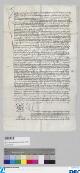 Notariatsinstrument des Linhart Erngroß von Gastein über die Übergabe der Citation des Heinrich von Lynne, Freigrafen, durch König Friedrich III. vor das königliche Hofgericht an Graf Conrat von Lynnehorst zu Döpmund vor dem wynhus genant Bachouen. - Zeugen: Dytrich von Wickede, Rotger von dem Vyttingkhoue genant Nortkirch, Eneyd von Wyckede Knahhen und Priester Johann Bramey Notar, alle Freischöffen. |