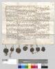 Apel v. Krewlshein verschreibt seiner ehelichen Wirtin Anna, Tochter des Herrn Konrad v. Merkingen einen Hof (hat Heinz Kuch), 9 Güter (Heinz Kuch, Ulrich Feurer, Contz Feurer, Hans Metz, Heppin, Vortwin, Veterman) und die Schmiede zu Ertzperg, 3 Güter (Betzold Viez, Contz Hartmut, Betzold Mulner) und 1 Wiese (Contz Hartmut) zu Rod, 2 Güter zu Walthusen (Swartz Walther), ein Gut zu Botenwiler (Betzold Mo{e}k und der Schreiber), 4 Güter zu Mu{e}len (Heintz, Ulrich Resch, Walther Viez, Mülner) und alles, was er zu Espech hat, unter Vorbehalt des Wiederkaufs um 500 lb Heller, als Heimsteuer und Morgengabe, - Bürgen: Heinz Taub, Beringer Berler gesessen zu Tullaw, Ritter Brand v. Sainshein, Contz v. Kirchberg, Hans v. Talhein, Albrecht v. Crailsheim. - Mitsiegler: die Bürgen. |